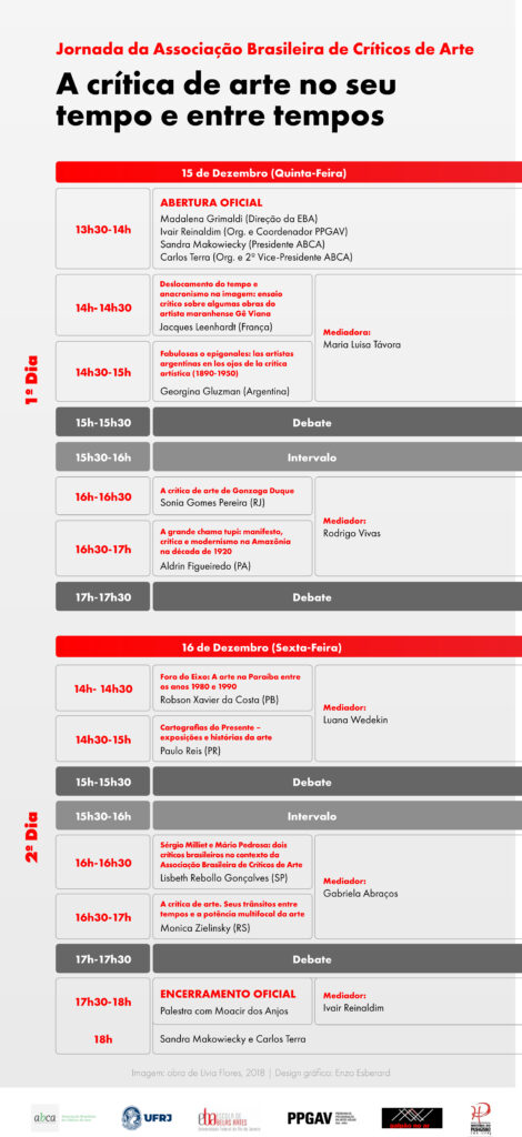 A Escola de Belas Artes da UFRJ, juntamente com seu Programa de Pós-Graduação em Artes Visuais (PPGAV), com o apoio dos Grupos de Pesquisa Paisagens Híbridas (GPPH) e História do Paisagismo (GPHP), sediará a Jornada da Associação Brasileira de Críticos de Arte (ABCA) em 2022. Pelas dificuldades encontradas neste primeiro ano de gestão da ABCA, optamos por fazer um evento sucinto, em formato on-line, nos dias 15 e 16 de dezembro, via plataforma zoom, com transmissão pelo YouTube. O encontro contará com oito comunicações, distribuídas em quatro diferentes mesas, seguidas de debate.