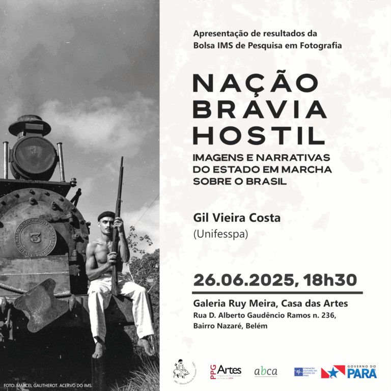 No dia 26 de junho, às 18h30, ocorre em Belém a palestra Nação bravia hostil: imagens e narrativas do Estado em marcha sobre o Brasil, tratando sobre fotografia, imprensa e história da Amazônia, com foco na expansão do Estado brasileiro sobre territórios no Sul do Pará, nos anos 1940 e 1950. A palestra busca apresentar os resultados de pesquisa desenvolvida pelo Prof. Dr. Gil Vieira Costa (Unifesspa) na 5ª edição da Bolsa IMS de Pesquisa em Fotografia, promovida pelo Instituto Moreira Salles em 2023 com o tema Em nome do vazio. Fotografia, conquista e colonização de Estado no âmbito da Marcha para o Oeste. A programação é uma realização conjunta entre os Programas de Pós-graduação em Artes (PPGARTES) e em