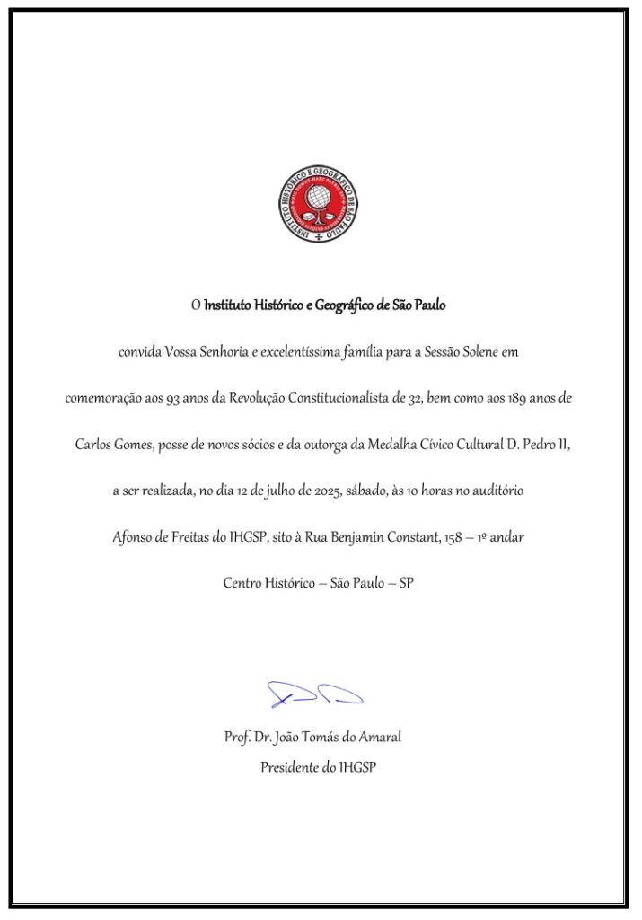 A professora e associada ABCA, Daisy Valle Machado Peccinini, convida a todos para a cerimônia de sua posse no Instituto Histórico e Geográfico de São Paulo. A Sessão Solene, que também ocorrerá em comemoração aos 93 anos da Revolução Constitucionalista de 32, bem como aos 189 anos de Carlos Gomes, irá realizar-se, no dia 12 de julho de 2025, sábado, às 10 horas, no auditório Afonso de Freitas do IHGSP, Rua Benjamin Constant, 158, Centro Histórico – São Paulo – SP