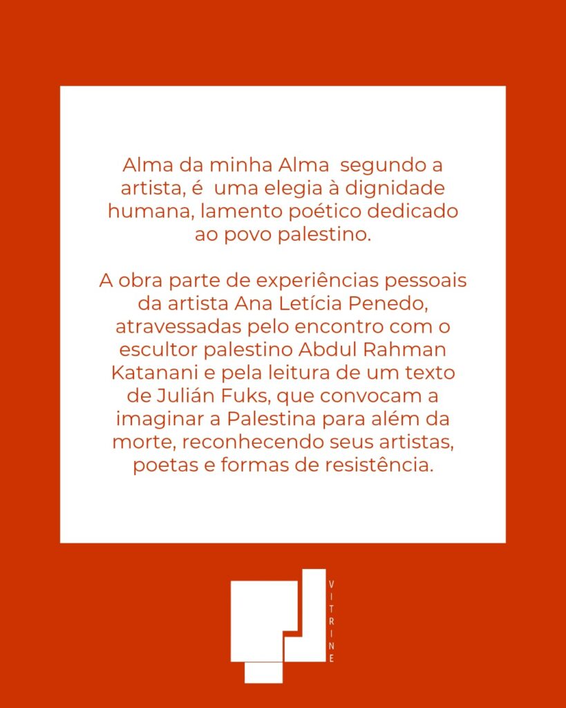 Na exposição “alma da minha alma” de Ana Letícia Penedo, com curadoria de Sylvia Werneck, membro da ABCA, experiências pessoais da artista se entrelaçam ao encontro com o escultor palestino Abdul Rahman Katanani e à leitura de um texto de Julián Fuks, convocando o público a imaginar a Palestina para além da morte, reconhecendo seus artistas, poetas e formas de resistência.
