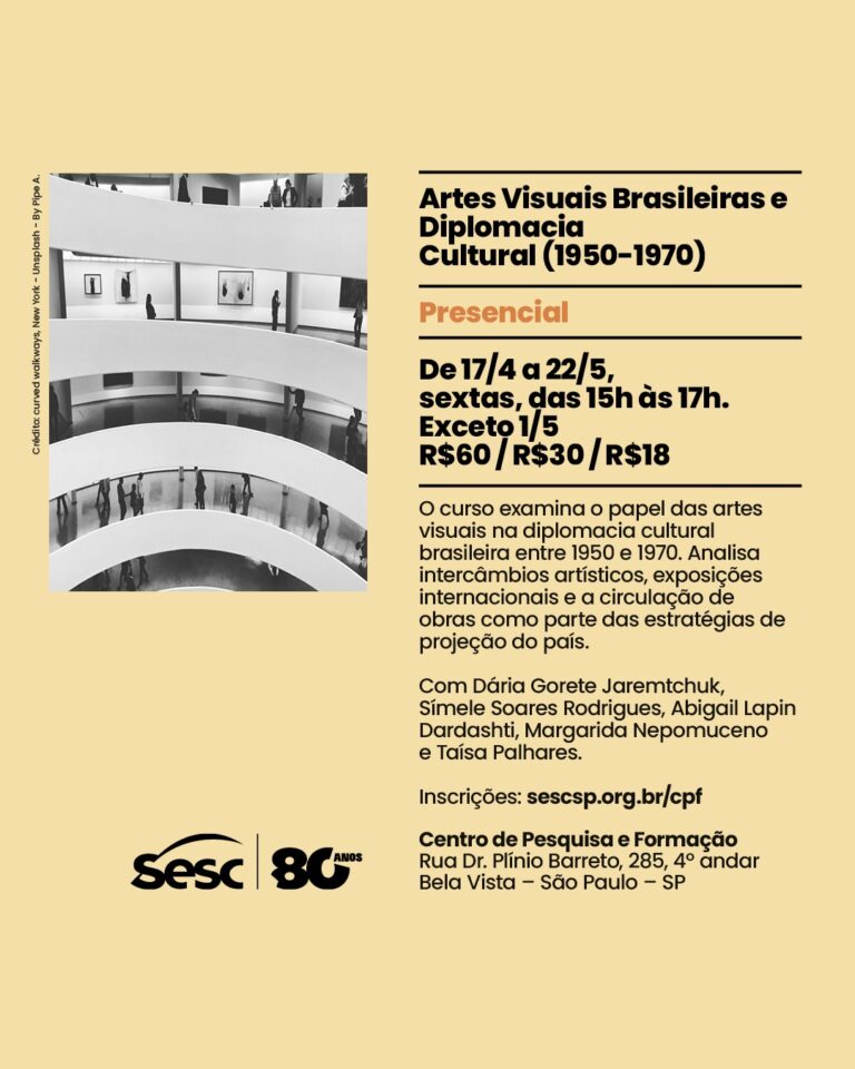 Nossa associada Taísa Palhares está entre as ministrantes do curso presencial *Artes Visuais Brasileiras e Diplomacia Cultural (1950–1970)*, organizado sob curadoria e mediação de Dária Gorete Jaremtchuk, no Centro de Pesquisa e Formação do Sesc.