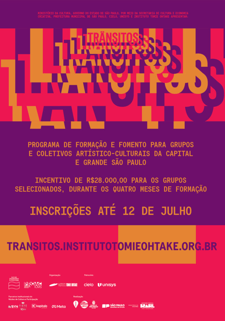 TRÂNSITOS é um Programa de formação de Lideranças em Cultura desenvolvido pelo Núcleo deCultura e Participação do Instituto Tomie Ohtake. O Programa Trânsitos se propõe a formar e fomentar grupos, coletivos e coletividades compostoprioritariamente por mulheres, pessoas negras residentes das periferias da capital e grande SãoPaulo, maiores de 18 anos, que possuam projetos no campo […]